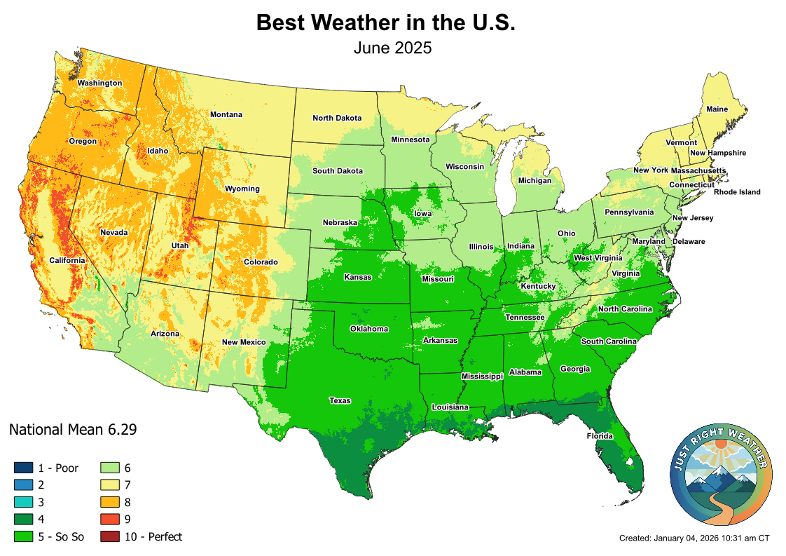 June is the month to head west and up in elevation. The Pacific Northwest, northern California mountains, and Intermountain West offer the most reliable comfort. Large portions of the South and central Plains are among the least comfortable in the country as summer takes hold.