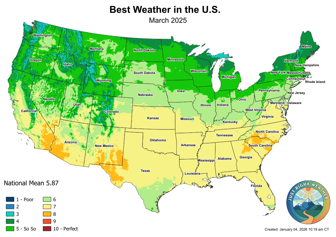 March favors regions where warming temperatures arrive before summer humidity and storm activity become common. The desert Southwest continues to lead, but the Southeast begins to emerge as a strong performer as temperatures moderate and cold fronts become less frequent.