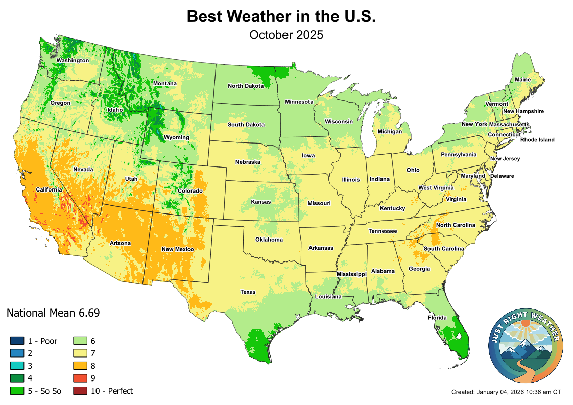 This map shows where weather is most comfortable across the United States during October, based on Perfect Weather Index scores averaged across recent years.